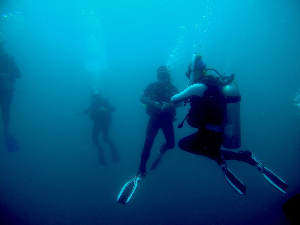 I sit on the edge of the boat, regulator in place, heart ticking between anticipation and focus. One final breath, one last check—and I step off. The ocean wraps around me in a rush of cool silence. My breathing steadies, bubbles rising past my ears, the surface noise gone in an instant.