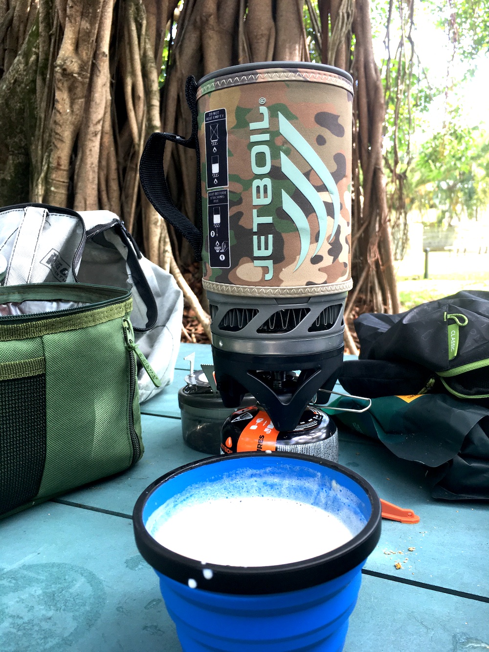 The Jetboil Flash stove boils water, quickly. It also uses significantly less gas than my previous stove. Where I would take two medium gas cylinders on a 30-day trip, I could get away with only two small canisters with the Jetboil.